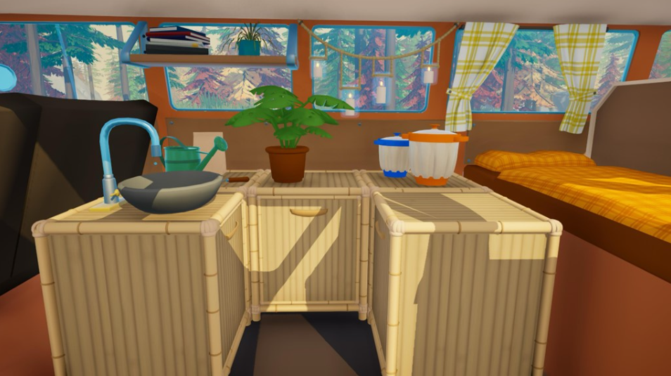 Build your moving base with a modular building system. Customize your vehicle with paint, decorations, and furniture to create your own perfect cozy place.