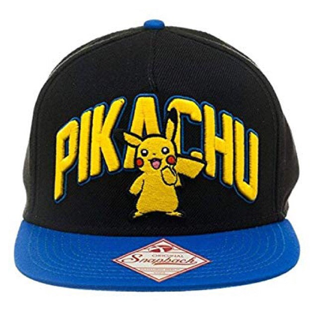 Our Pikachu Blue Bill Snapback Hat is adjustable and features Pikachu and his name raised on a black crown with a flat blue bill. Made from 52% polyester, 26% rayon and 2% spandex.